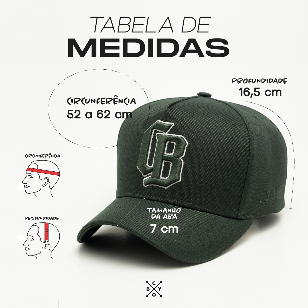 Profundidade: 16,5 cm (medir por fora acompanhando a costura do boné até a base);